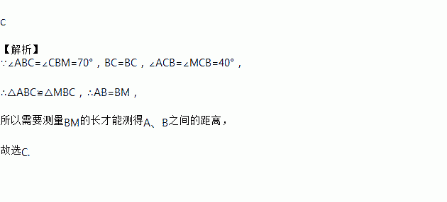 如图,为测量B点到河对面的目标A之间的距离,他们在B点同侧选择了一点C,测得∠ABC=70°,∠ACB=40°,然后在M处立了标杆,使∠CBM=70°,∠BCM=40°,那么需要测量________才能测得A,B之间的距离( )