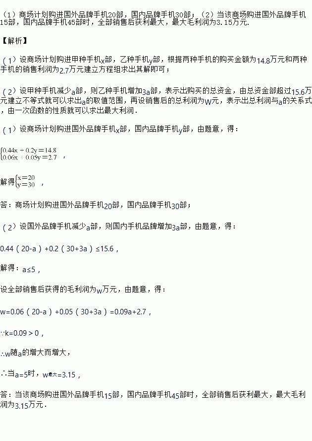 (1)该商场计划购进国外品牌、国内品牌两种手机各多少部?