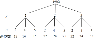 ∴共有9种等可能的结果,这两张卡片组成的两位数字被3整除的有12,15,24,