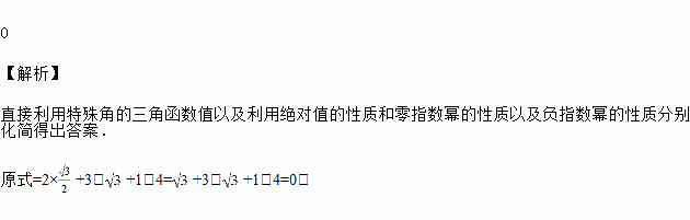计算:2sin60°+|3﹣|+(π﹣5)0﹣()﹣1
