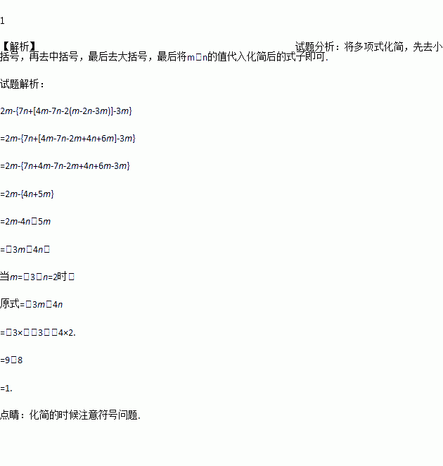 2m-{7n+[4m-7n-2(m-2n-3m)]-3m},其中 m=-3 , n=2.