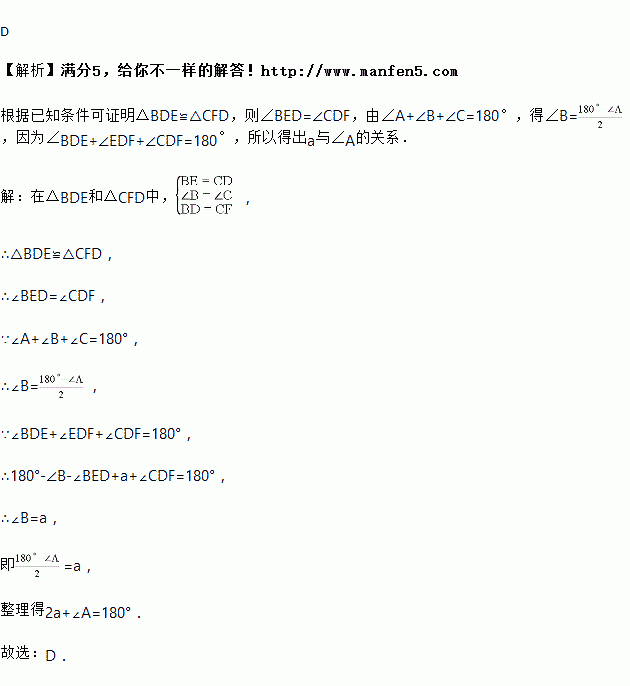 如图,△ABC中,AB=AC,BD=CF,BE=CD,∠EDF=a,则下列结论正确的是( )