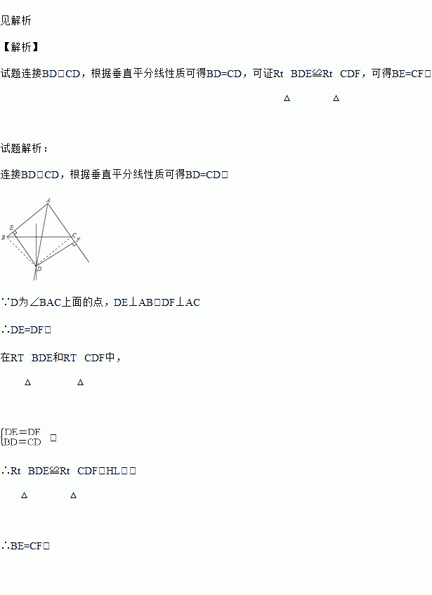 已知:如图∠BAC的角平分线与BC的垂直平分线交与点D,DE⊥AB,DF⊥AC,垂足分别为E,F.求证:BE=CF.