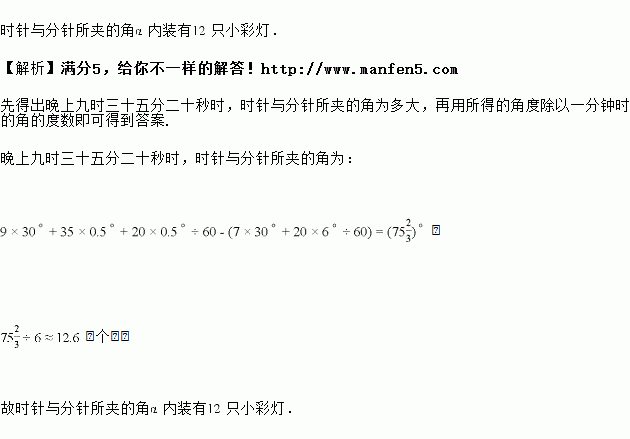 某钟楼上装有一电子报时钟,在钟面的边界上,每一分钟的刻度处,都装有一只小彩灯,晚上九时三十五分二十秒时,时针与分针所夹的角内装有多少只小彩灯?