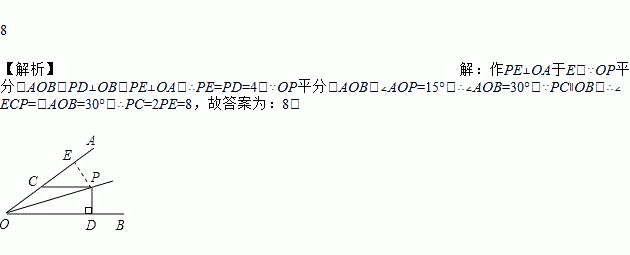 如图,OP平分∠AOB,∠AOP=15°,PC∥OB,PD⊥OB于点D,PD=4,则PC等于 .
