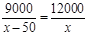 解析试题分析:设该校第二次有x人捐款,则第一次有(x–50)人捐款,根据“第一次捐款总额为9000元,第二次捐款总额为12000元,且两次人均捐款额相等”即可列方程求解.
