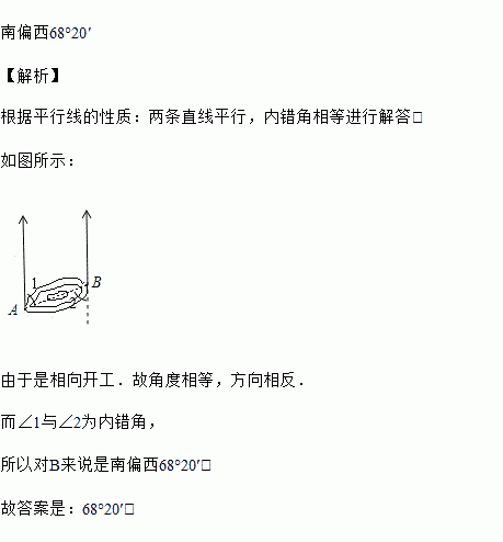 如图所示,A,B之间有一座山,一条笔直的铁路要通过A,B两地,在A地测得铁路的走向是北偏东68°20',如果A,B两地同时开工,那么在B地按____方向施工才能使铁路在山中准确接通.