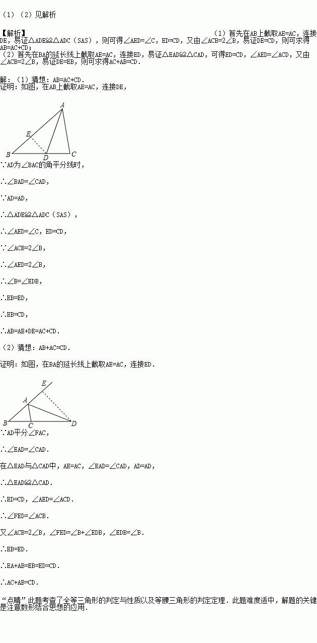 (2)如图③,当AD为△ABC的外角平分线时,线段AB、AC、CD又有怎样的数量关系?请写出你的猜想,并对你的猜想给予证明.