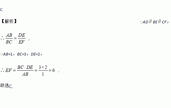 C 【解析】∵AD∥BE∥CF, ∴ , ∵AB=1,BC=3,DE=2, ∴ . 故选C.