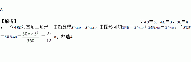 如图,在△ABC中,AB=5,AC=3,BC=4,将△ABC绕点A逆时针旋转30°后得到△ADE,点B经过的路径为弧BD,则图中阴影部分的面积为( )