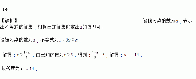 小明在解一个一元一次不等式时,发现不等式的右边“■”处被墨迹污染看不清,所看到的不等式是:1-3x<■,他查看练习本后的答案才知道这个不等式的解集是x>5,那么被污染的数是____.