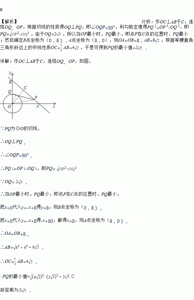 如图,⊙O是以原点为圆心,2为半径的圆,点P是直线y=-x+8上的一点,过点P作⊙O的一条切线PQ,Q为切点,则切线长PQ的最小值为( )