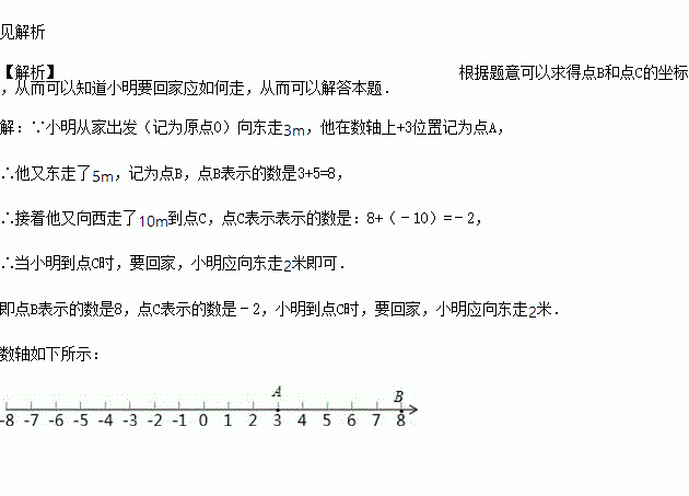 为点A,他又东走了5m,记为点B,点B表示什么数?接着他又向西走了10m到点C,点C表示什么数?请你画出数轴,并在数轴上标出点A、点B的位置,这时如果小明要回家,则小明应如何走?