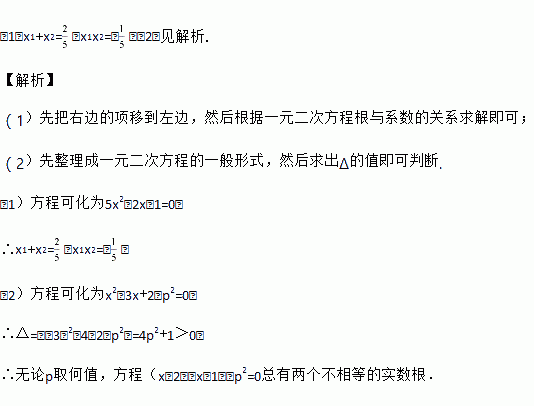 (1)不解方程,求方程5x2﹣1=2x的两个根x1、x2的和与积;