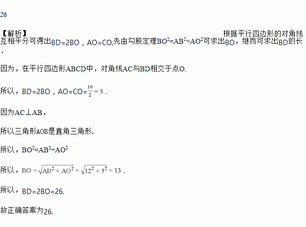 如图,平行四边形ABCD中,对角线AC与BD相交于点O.且AC⊥AB,垂足为点A.若AB=12,AC=10,则BD的长为________.