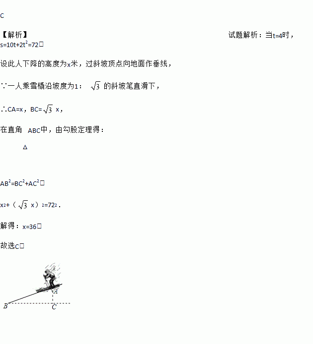 的斜坡笔直滑下,滑下的距离s(m)与时间t(s)间的关系为s=10t+2t2,若滑到坡底的时间为4s,则此人下降的高度为( )