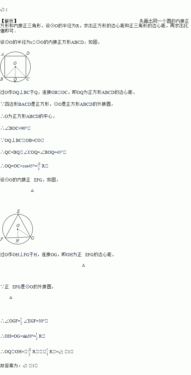 同一个圆的内接正方形和正三角形的边心距的比为_____.