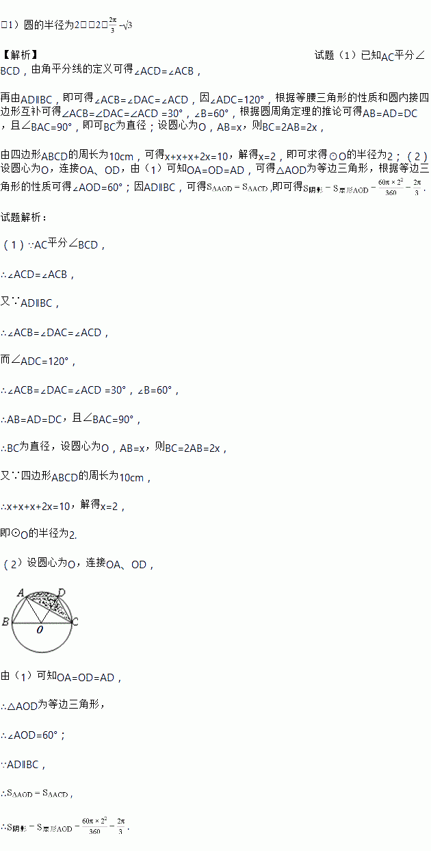 如图,已知点A,B,C,D均在已知圆上,AD∥BC,CA平分∠BCD,∠ADC=120°,四边形ABCD的周长为10.