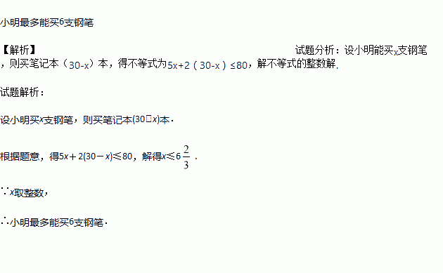 李老师奖励在数学竞赛中的优胜者,给小明80元去购买奖品笔记本和钢笔共30件,已知每本笔记本2元,每支钢笔5元,则小明最多能买多少支钢笔?