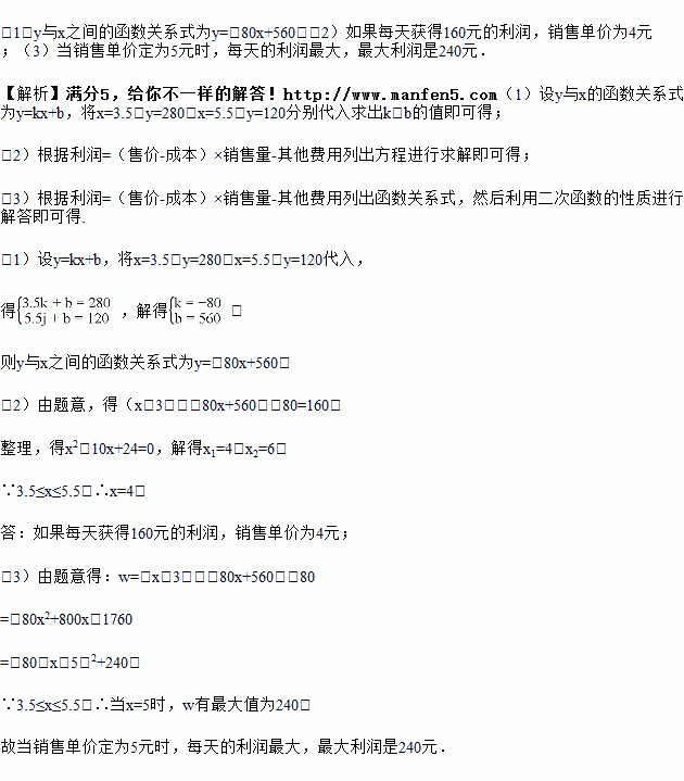 某大学生创业团队抓住商机,购进一批干果分装成营养搭配合理的小包装后出售,每袋成本3元.试销期间发现每天的销售量y(袋)与销售单价x(元)之间满足一次函数关系,部分数据如表所示,其中3.5≤x≤5.5,另外每天还需支付其他费用80元.