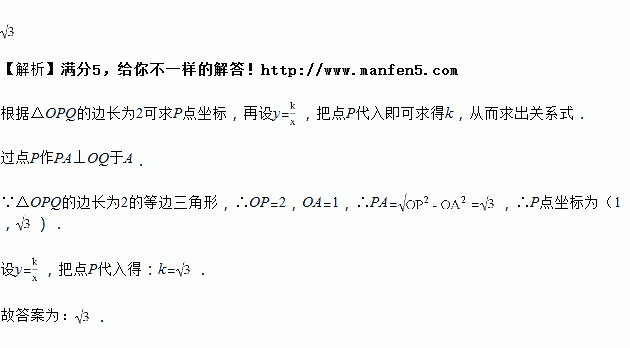 如图,是边长为的等边三角形,若反比例函数的图象经过点,则的值是________.