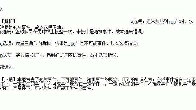 A. 通常加热100℃时,水沸腾 B. 篮球队员在罚球线上投篮一次,未投中