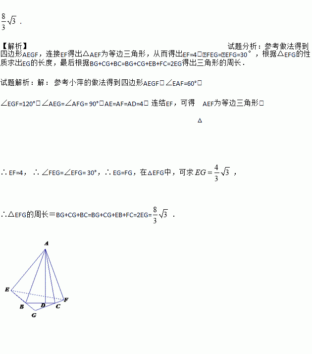 如图1,在△ABC中,已知∠BAC=45°,AD⊥BC于D,BD=2,DC=3,求AD的长. 小萍同学灵活运用轴对称知识,将图形进行翻折变换如图1.她分别以AB、AC为对称轴,画出△ABD、△ACD的轴对称图形,D点的对称点为E、F,延长EB、FC相交于G点,得到四边形AEGF是正方形.设AD=x,利用勾股定理,建立关于x的方程模型,即可求出x的值.参考小萍的思路,探究并解答新问题:如图2,在△ABC中,∠BAC=30°,AD⊥BC于D,AD=4.请你按照小萍的方法画图,得到四边形AEGF,求△BGC的周长.(画图所用字母与图1中的字母对应)