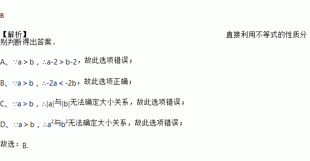 A. a﹣2<b﹣2 B. ﹣2a<﹣2b C. |a|>|b| D. a2>b2