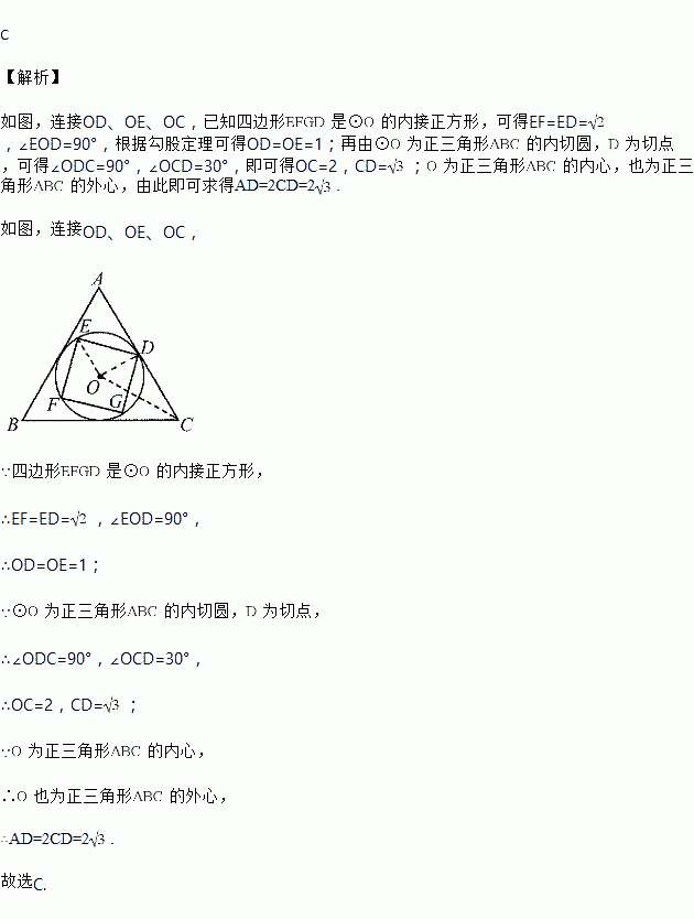 如图,已知⊙为正三角形的内切圆,为切点,四边形是⊙的内接正方形,,则正三角形的边长为( )