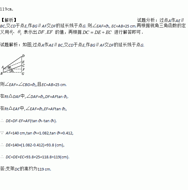 如图(图①为实景侧视图,图②为安装示意图),在屋顶的斜坡面上安装太阳能热水器:先安装支架AB和CD(均与水平面垂直),再将集热板安装在AD上.为使集热板吸热率更高,公司规定:AD与水平线夹角为θ1,且在水平线上的射影AF为1.4 m.现已测量出屋顶斜面与水平面夹角为θ2,并已知tan θ1=1.082,tan θ2=0.412.如果安装工人已确定支架AB高为25 cm,求支架CD的高.(结果精确到1 cm)