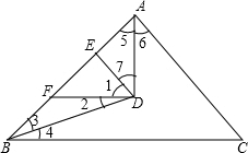 分析:首先根据三角形内角和定理与角平分线的性质求出∠ADB的度数,再根据平行线的性质求出∠2+∠7的度数,即可解答.