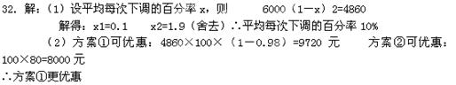 (2)某人准备以开盘价均价购买一套100平方米的住房,开发商给予以下两种优惠方案以供选择:①打9.8折销售;②不打折,一次性送装修费每平方米80元,试问哪种方案更优惠?