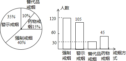 18£®2011Äê1ÔÂ1ÈÕÆðÔÚ¹«ÖÚ³¡ËùʵÐС°½ûÑÌ¡±£¬ÎªÅäºÏ¡°½ûÑÌ¡±Ðж¯£¬Ä³Ð£×é֯ͬѧÃÇÔÚijÉçÇø¿ªÕ¹ÁË¡°ÄãÖ§³ÖÄÄÖÖ½äÑÌ·½Ê½¡±µÄÎʾíµ÷²é£¬Õ÷ÇóÊÐÃñµÄÒâ¼û£¬²¢½«µ÷²é½á¹ûÕûÀíºóÖÆ³ÉÁËÈçÏÂÁ½¸öͳ¼ÆÍ¼£º¸ù¾Ýͳ¼ÆÍ¼½â´ð£º