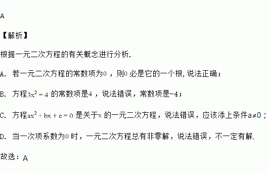 D. 当一次项系数为时,一元二次方程总有非零解![]()