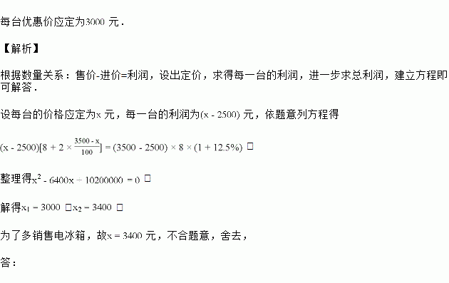 某商场销售的某型号冰箱,每台进价为2500元,当售价为3500元时,平均每天能售出8台.经调查,电冰箱的售价每降低100元,平均每天能多售出2台.为了使销售这种电冰箱每天的利润增加12.5%,每台电冰箱的优惠价应定为多少元?
