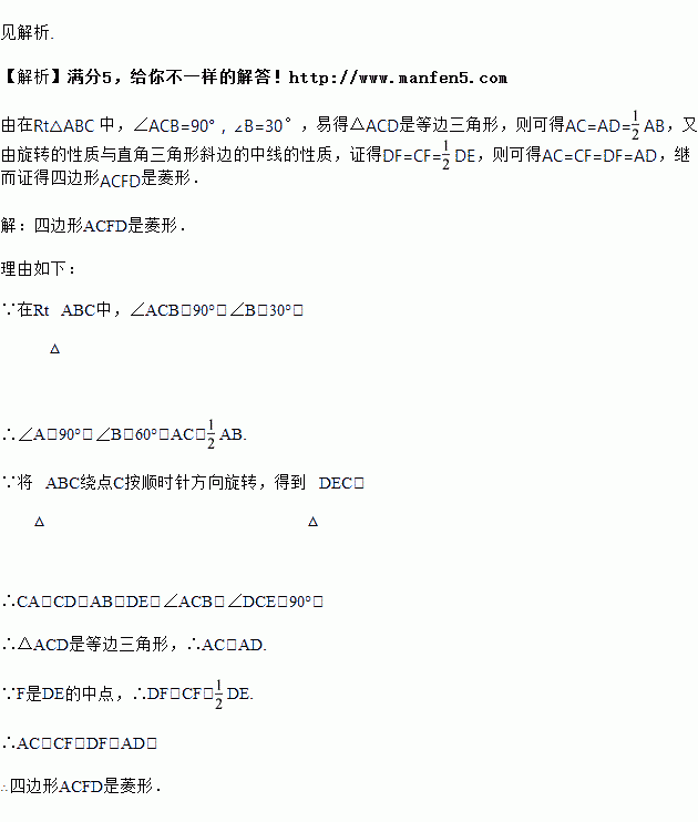 如图所示,在Rt△ABC中,∠ACB=90°,∠B=30°,将△ABC绕点C按顺时针方向旋转,可以得到△DEC.若点D刚好落在AB边上,取DE边的中点F,连接FC,试判断四边形ACFD的形状,并说明理由.