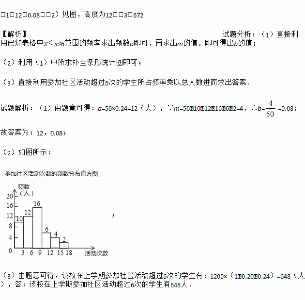 射阳县实验初中为了解全校学生上学期参加社区活动的情况,学校随机调查了本校50名学生参加社区活动的次数,并将调查所得的数据整理如下: