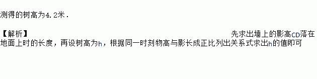 如图,一位同学想利用树影测量树高(AB),他在某一时刻测得高为1m的竹竿影长为0.9m,但当他马上测量树影时,因树靠近一幢建筑物,影子不全落在地面上,有一部分影子在墙上(CD),他先测得留在墙上的影高(CD)为1.2m,又测得地面部分的影长(BC)为2.7m,他测得的树高应为多少米?