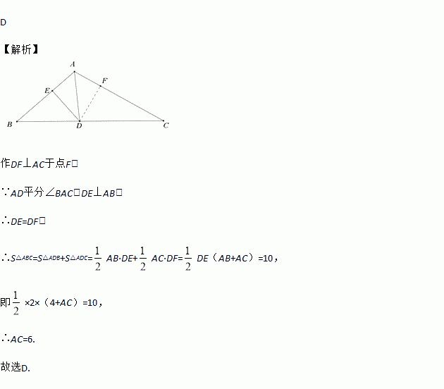 D 【解析】 作DF⊥AC于点F, ∵AD平分∠BAC,DE⊥AB, ∴DE=DF, ∴S△ABC=S△ADB+S△ADC=AB·DE+AC·DF=DE(AB+AC)=10, 即×2×(4+AC)=10, ∴AC=6. 故选D.