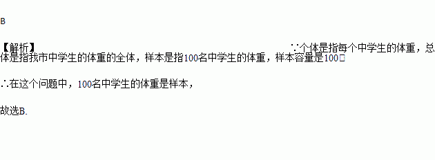 为了了解商丘市中学生的体重情况,从某一中学任意抽取了100名中学生进行调查,在这个问题中,100名中学生的体重是( )