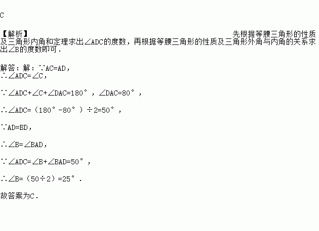 如图1,△ABC中,AC=AD=BD,∠DAC=80º,则∠B的度数是