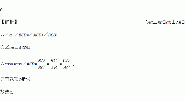 如图,点A为∠α边上任意一点,作AC⊥BC于点C,CD⊥AB于点D,下列用线段比表示cosα的值,错误的是( )