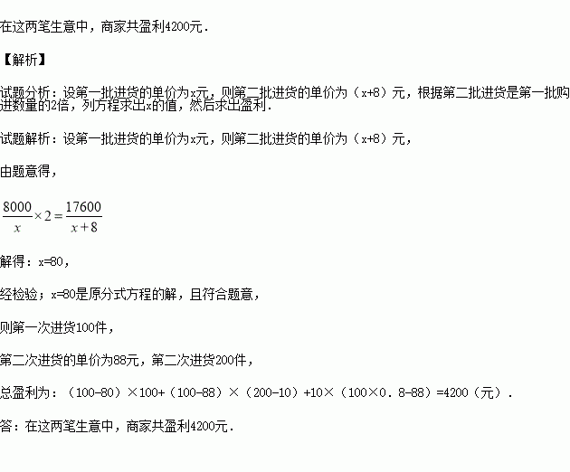 某服装商预测一种应季衬衫能畅销市场,就用8000元购进一批衬衫,面市后果然供不应求,服装商又用17600元购进了第二批这种衬衫,所购数量是第一批购进数量的2倍,但单价贵了8元.商家销售这种衬衫时每件定价都是100元,最后剩下10件按8折销售,很快售完.在这两笔生意中,商家共盈利多少元?