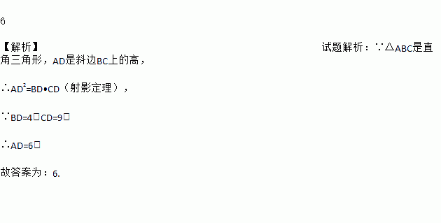6 【解析】试题解析:∵△ABC是直角三角形,AD是斜边BC上的高, ∴AD2=BD•CD(射影定理), ∵BD=4,CD=9, ∴AD=6. 故答案为:6.