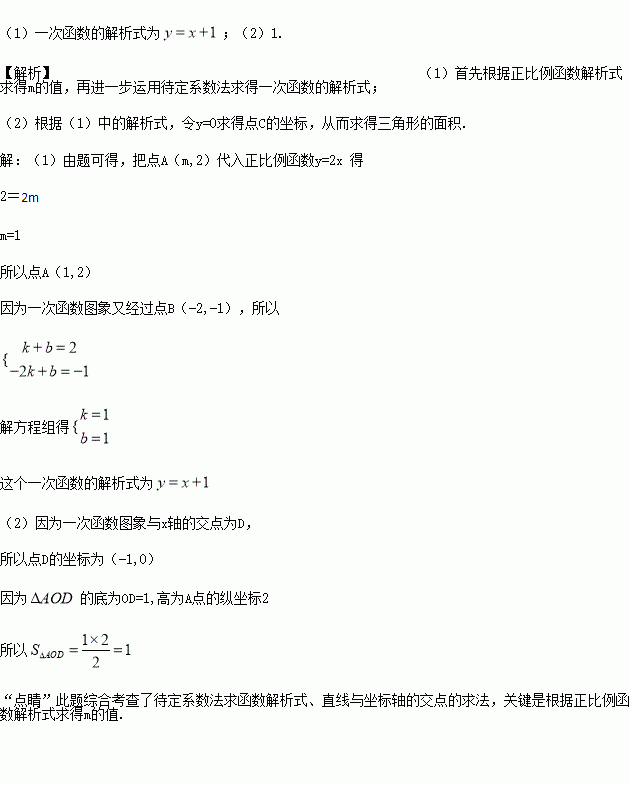 如图正比例函数y=2x的图像与一次函数 的图像交于点A(m,2),一次函数的图象经过点B(-2,-1)与y轴交点为C与x轴交点为D.