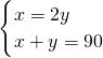 如图,∠AOB=90°,∠AOC是∠BOC的2倍,设∠AOC、∠BOC的度数分别为x、y,则可列方程组