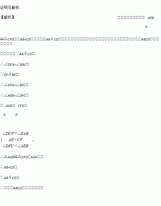 已知:如图,在四边形ABCD中,AB∥CD,E,F为对角线AC上两点,且AE=CF,DF∥BE.