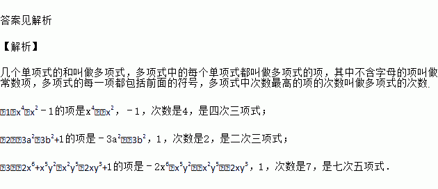指出下列多项式的项和次数,并说明它们是几次几项式,