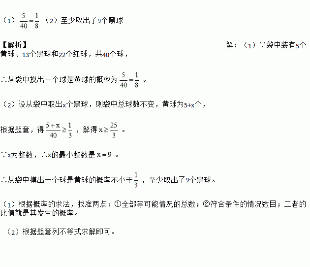 (2)现从袋中取出若干个黑球,并放入相同数量的黄球,搅拌均匀后,使从袋中摸出一个球是黄球的概率不小于