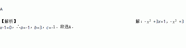 A 【解析】【解析】 -+3x=1,-+3x-1=0,∴a=-1,b=3,c=-1.故选A.